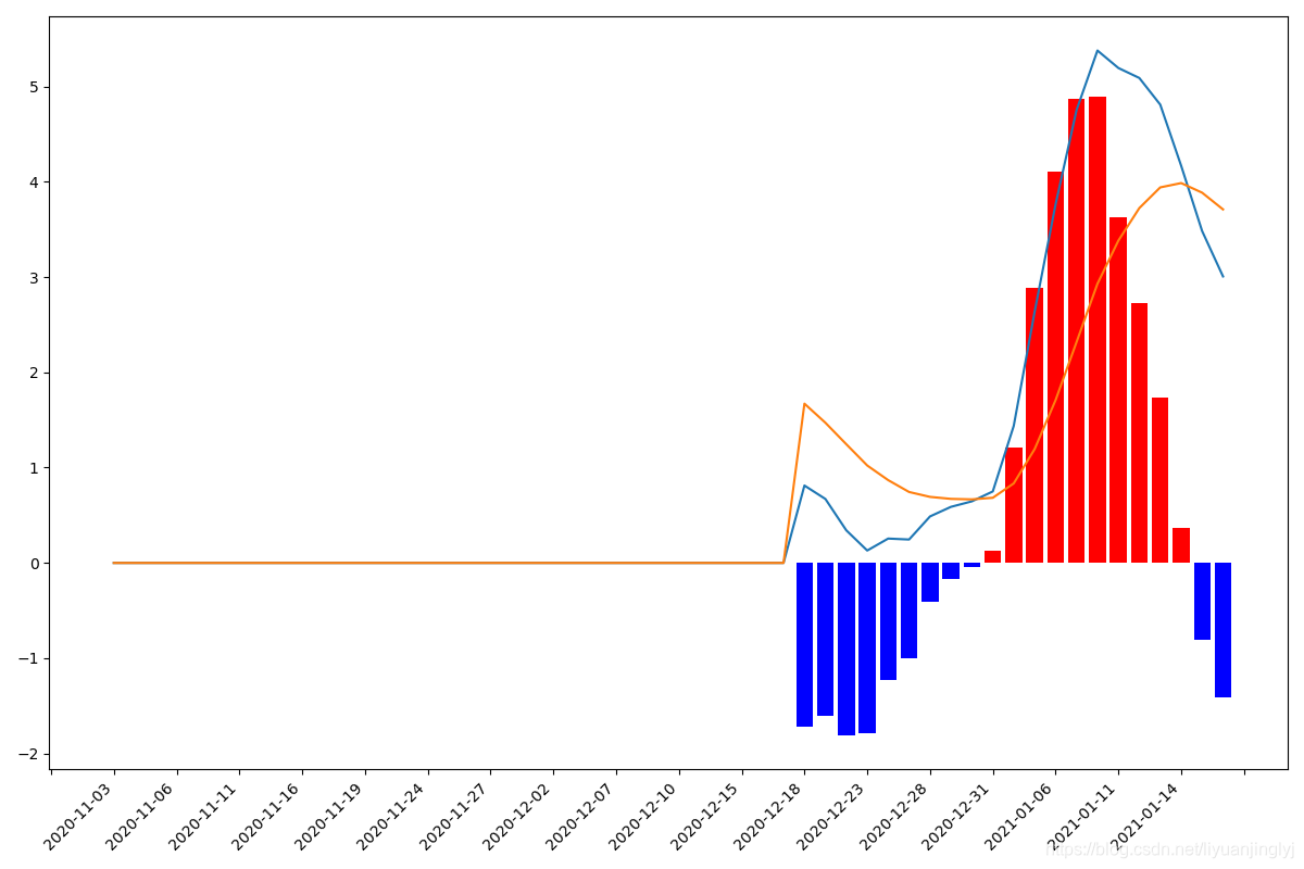 import pandas as pd import talib import numpy as np import matplotlib.pyplot as plt import matplotlib.ticker as ticker fig = plt.figure(figsize=(12, 8)) ax = fig.add_subplot(111) df = pd.read_excel("牧原股份.xlsx") df['date'] = pd.to_datetime(df['date']) df['date'] = df['date'].apply(lambda x: x.strftime('%Y-%m-%d')) dif, dea, bar = talib.MACD(df['close'].values, fastperiod=12, slowperiod=26, signalperiod=9) dif[np.isnan(dif)], dea[np.isnan(dea)], bar[np.isnan(bar)] = 0, 0, 0 ax.plot(np.arange(0, len(df)), dif) ax.plot(np.arange(0, len(df)), dea) red_bar = np.where(bar > 0, 2 * bar, 0) blue_bar = np.where(bar < 0, 2 * bar, 0) ax.bar(np.arange(0, len(df)), red_bar, color="red") ax.bar(np.arange(0, len(df)), blue_bar, color="blue") ax.xaxis.set_major_locator(ticker.MaxNLocator(20)) def format_date(x, pos=None): # 由于前面股票数据在 date 这个位置传入的都是int # 因此 x=0,1,2,... # date_tickers 是所有日期的字符串形式列表 if x < 0 or x > len(df['date']) - 1: return '' return df['date'][int(x)] ax.xaxis.set_major_formatter(ticker.FuncFormatter(format_date)) plt.setp(plt.gca().get_xticklabels(), rotation=45, horizontalalignment='right') plt.show()