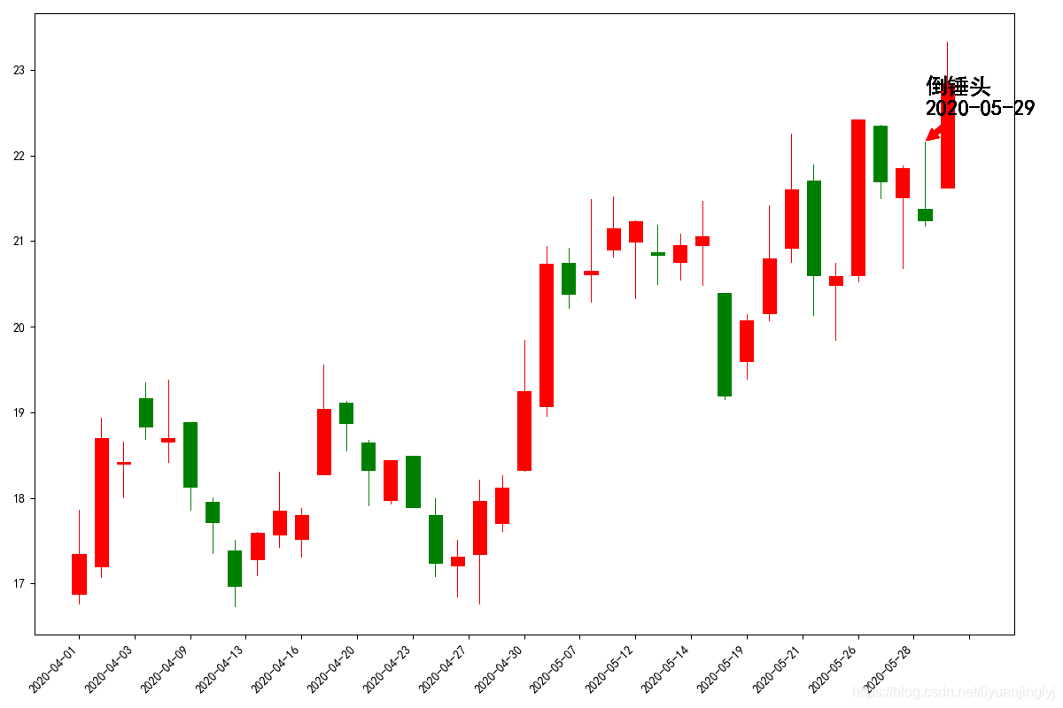 既然有正锤头,那么肯定也有倒锤头,TA-Lib库提供给我们的方法为talib.CDLINVERTEDHAMMER(),它也是一日K线,定义为上影线较长,长度为实体的2倍以上,无下影线,在下跌趋势底部,预示着趋势反转。