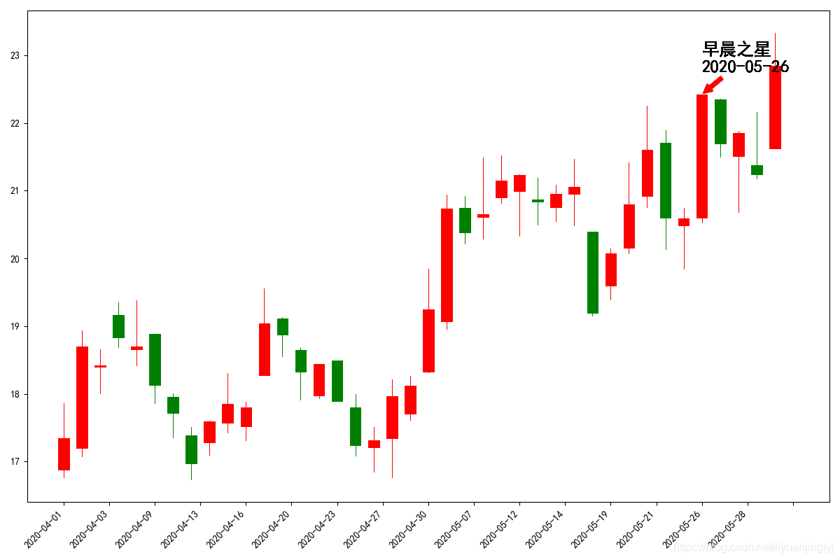 早晨之星为三日K线模式,定义为下跌趋势,第一日为阴线,第二日价格振幅较小,第三天阳线,预示着底部可能会有反转。TA-Lib库提供给我们的方法为talib.CDLMORNINGSTAR()。