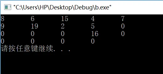 #include <iostream> using namespace std;//定义标示符 #define MAX 20 /* 生成二叉树思路: 所有结点都需要和根结点比较大小,小于根结点的结点放在左子树, 反之,大于根结点的结点放在右子树。 本算法需要定义两个数组,数组b_tree用于存储最终的二叉树,数组node用于 保存结点数值,为了使数组的下标和结点的编号相对应,b_tree[0]不存储数据, 从b_tree[1]开始存储。 */ void Create_bTree(int *b_tree, int *node, int len) { int i; int level;//定义某个整数 b_tree[1] = node[1];//从b_tree[1]开始存储 for (i = 2; i < len; i++) { level = 1; while (b_tree[level] != 0) //结点为空,退出循环,进行存储 { if (node[i] < b_tree[level]) level = 2 * level; else level = 2 * level + 1; }/*所有结点都需要和根结点比较大小,小于根结点的结点放在左子树, 反之,大于根结点的结点放在右子树。*/ b_tree[level] = node[i];//进行存储 } } int main() { int b_tree[MAX] = { 0 }; //初始为空 int node[11] = { 0,8,6,7,4,2,5,15,9,19,16 };//8是根结点 Create_bTree(b_tree, node, 11); for (int i = 1; i < MAX; i++) { cout << b_tree[i] << "\t"; if (i % 5 == 0) cout << endl; } cout << endl; system("pause");//执行系统环境中的pause命令,冻结屏幕,用户按任意键结束。 return 0; }