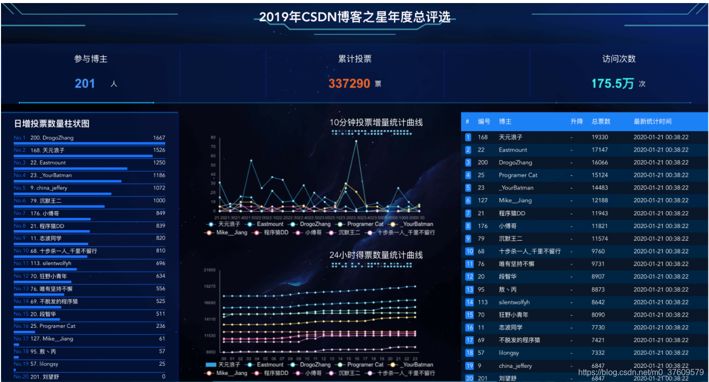 这个项目的起源非常的偶然,源于今年我有幸入选2019年CSDN博客之星年度总评选,并且排名一直还不错,在前20的行列中,而排名第一的天元浪子大大,用python分析了一波投票情况,我本人对自己也非常感兴趣,但因为我不会用python,而且python画出来的统计图不是动态图,于是我就想用Java做后端,前端用图表组件做个靓靓的大屏监控出来。大概花了两天时间,初见成效。现在简单介绍如下: