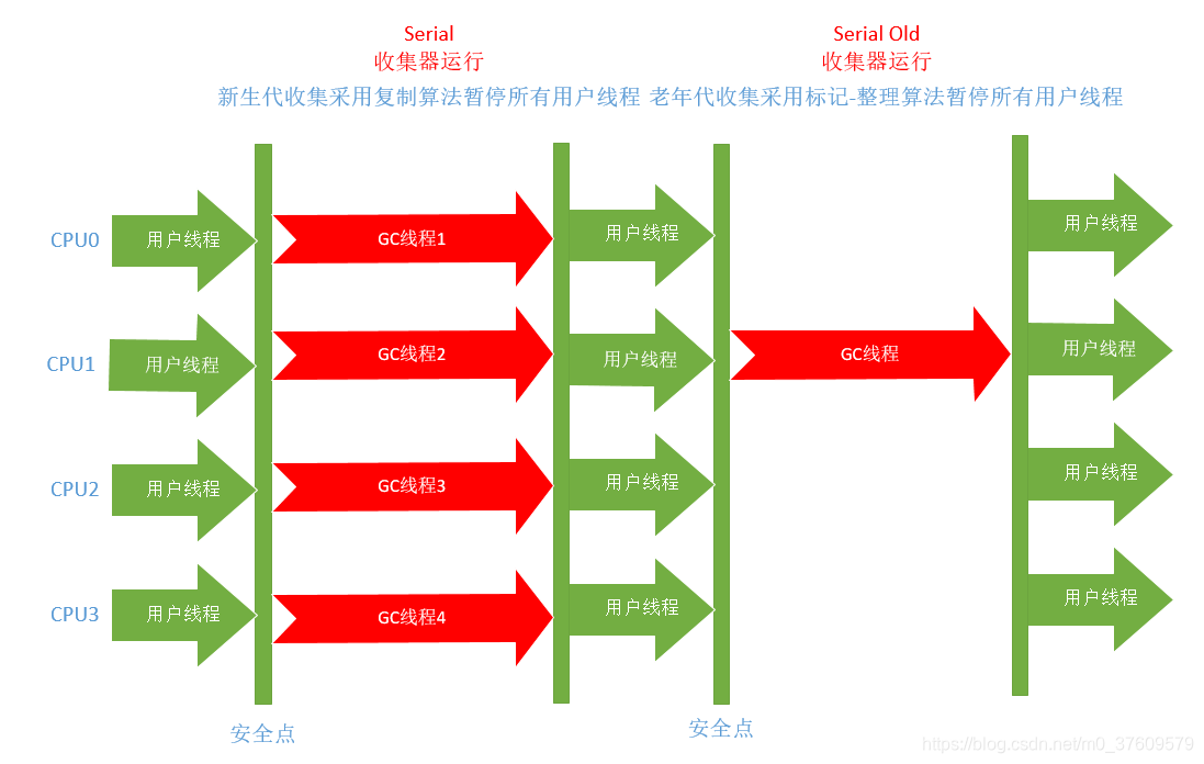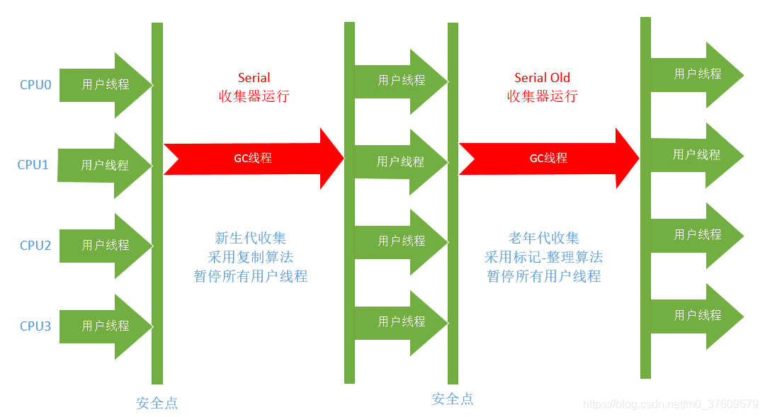 使用场景主要为客户端。是最基本,发展最悠久的单线程垃圾收集器,是JDK1.3.1前HotSpot新生代收集的唯一选择。分为新生代和老年代两个,分别采用了复制算法和标记-整理算法。