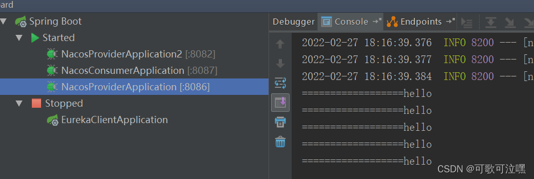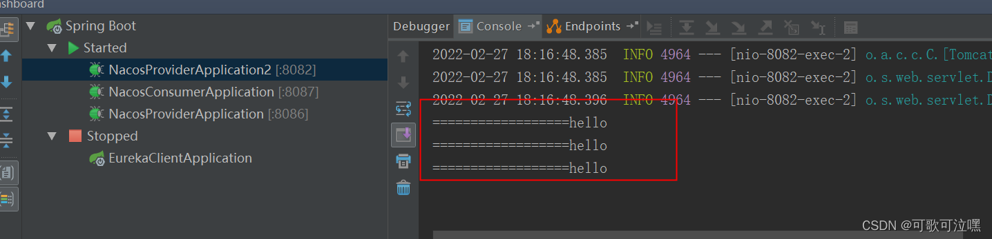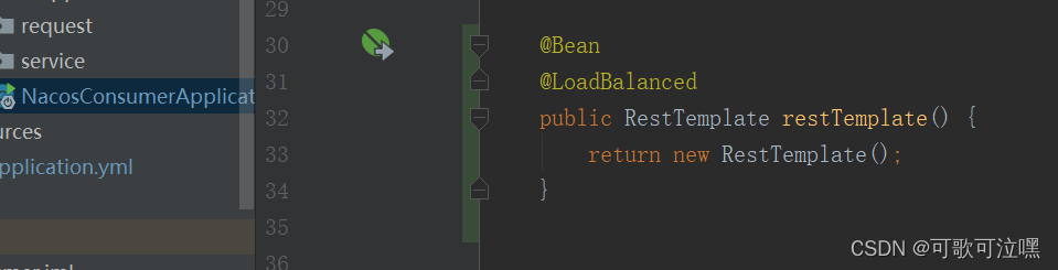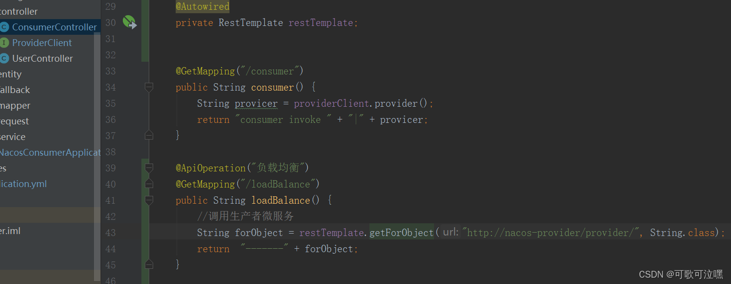 @@RestController @Slf4j public class ConsumerController { @Autowired private RestTemplate restTemplate; @ApiOperation("负载均衡") @GetMapping("/loadBalance") public String loadBalance() { //调用生产者微服务 String forObject = restTemplate.getForObject("http://nacos-provider/provider/", String.class); return "-------" + forObject; } }