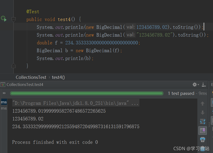 System.out.println(new BigDecimal(123456789.02).toString()); System.out.println(new BigDecimal("123456789.02").toString()); double f = 234.353333000000000000000000; BigDecimal b = new BigDecimal(f); System.out.println(b);