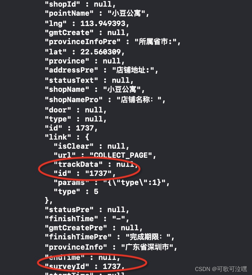 二、下面两个id是一致的,点位采点要把survey ID带过去,添加接口把survey ID再传回给到后台,然后这个点位就绑定上了店铺