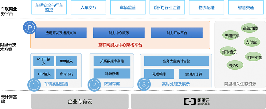 阿里云的车联网提供3+1的技术方案,面向车机端的3个平台:车辆实时连接平台、数据存储平台和实时处理和展现平台。除了3个面向车量连接的平台外,我们还提供了面向上层应用的,基于共享能力中心理论的企业互联网+架构和中间件平台产品。