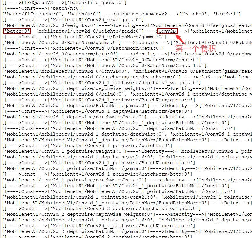 以《MobileNet V1官方预训练模型的使用》文中介绍的MobileNet V1网络结构为例,下载MobileNet_v1_1.0_192文件并压缩后,得到mobilenet_v1_1.0_192.ckpt.data-00000-of-00001、mobilenet_v1_1.0_192.ckpt.index、mobilenet_v1_1.0_192.ckpt.meta文件。我们还需要知道mobilenet_v1_1.0_192.ckpt模型对应的输入和输出Tensor对象的名称,官方提供的压缩包文件中并没有告知。一种方法是运行官方代码,把输入Tensor的名称打印出来。但是运行官方代码本身就需要一定的时间和精力,在在上一篇文章《从Tensorflow模型文件中解析并显示网络结构图(pb模型篇)》的代码实现中已经实现了将原始网络结构对应的字符串写入到ori_network.txt文件中。因此,可以先随意填写输入名称和输出名称,待生成ori_network.txt文件后,从文件中可以直观看到原始网络结构。ori_network.txt文件部分内容如下所示。
