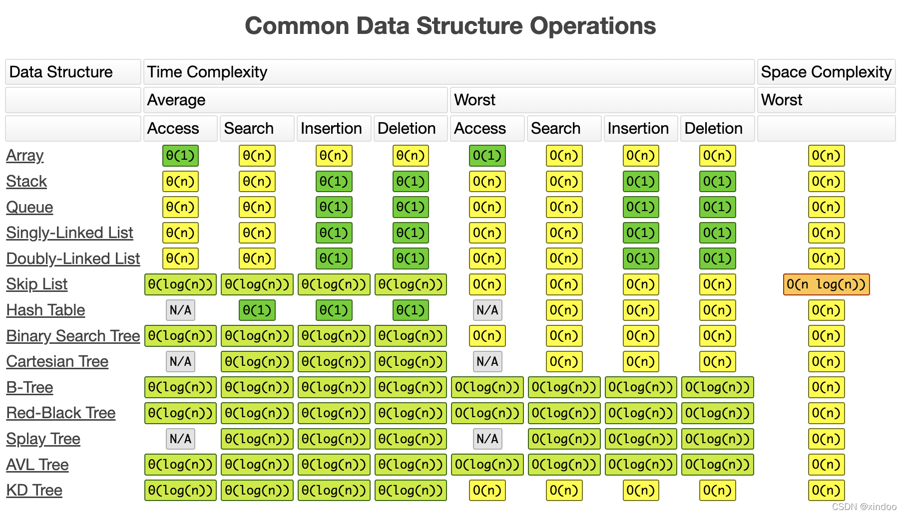 下图是各种常用数据结构各种操作的时间、空间复杂度供大家查阅: