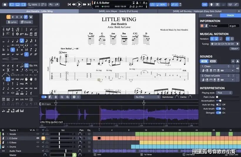 guitar pro可以循环播放乐谱供我们跟弹练习,当我们练熟了就可以把其中的一轨mute掉,然后边播放边自己弹,看看还有没有不熟练的小节。此外这个软件提供了很大的自由度,我们可以自己更换音色或者重新编曲,也可以修改乐曲的节拍,这对于节拍踩不稳的新手同学非常友好。