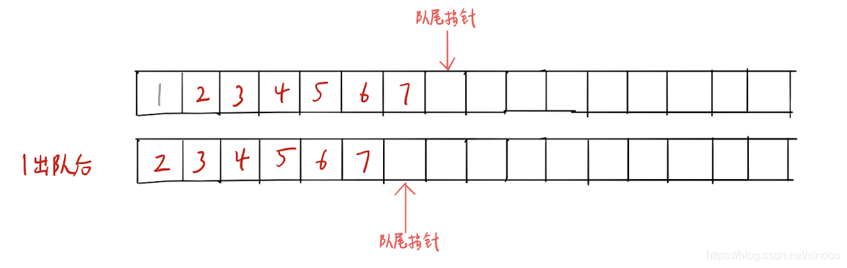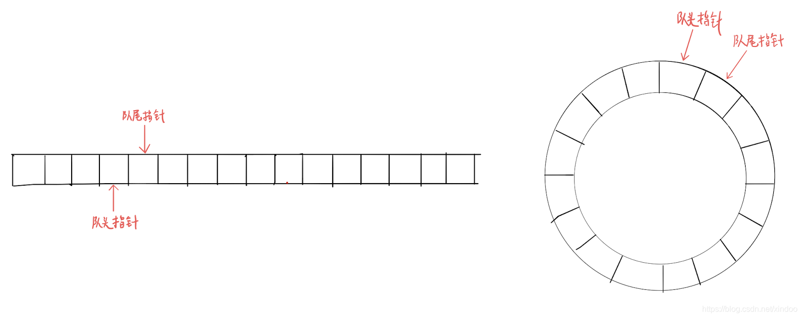 如果队列满,首尾指针是指向同一个位置,如下图。
