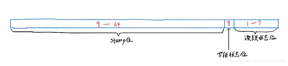 StampedLock用了long型作为state,这里是将其64位划分为3部分使用。低7位作为读锁的标志位,可以由多个线程共享,每有一个线程加了读锁,低7位就加1,那是不是只能有127个读者?当然不是,还有其他机制可以额外记录超过127的读者。第8位是写锁位,由线程独占。其余位是stamp位,记录有没有写锁状态的变化,每使用一次写锁,stamped位就会增加1,相当于整个state加了256。