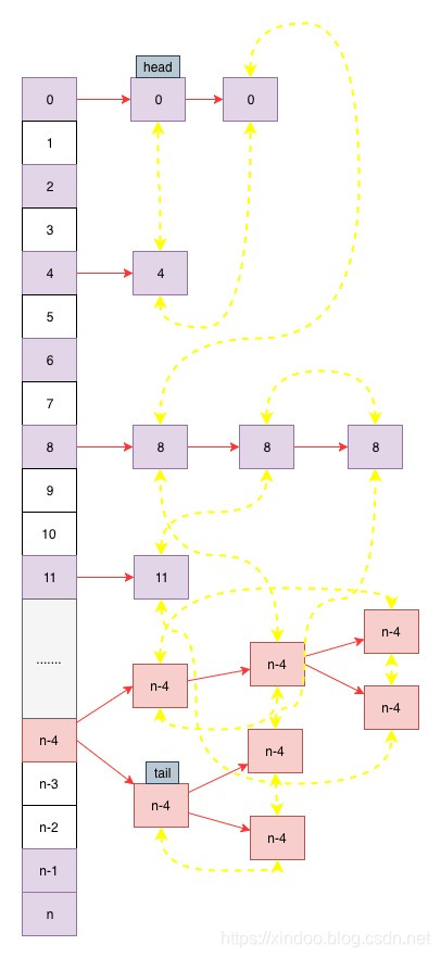 其实说白了,LinkedHashMap其实就是在HashMap+链表,就是用双链表把HashMap中的每个Node串起来,可以看如下示意图,黄色线条代表链表中的关系,主体结构还是HashMap中的结构,关于HashMap可以看我另一篇博客Java HashMap源码浅析 。所以较HashMap的源码,LinkedHashMap就是多加了一些双链表的操作(插入、删除、节点挪动到尾部……)。
