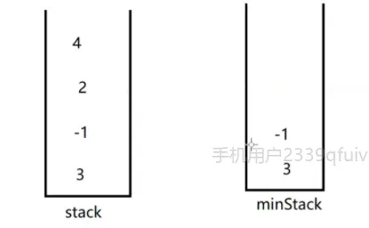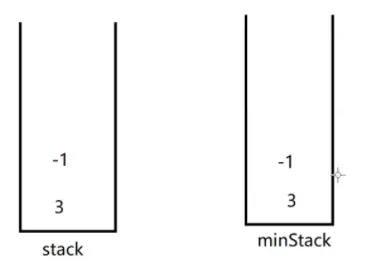 3:此时继续将-1入到stack栈中,-1此时小于3,那么-1这个元素要入到我们的minStack当中去,如下图所示: