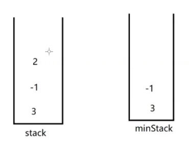 4:此时继续将2这个元素入到stack栈中去,然后将2和minStack的栈顶元素-1进行大小的判断,此时2大于-1,那么就将2这个元素不入到minStack中,如下图所示: