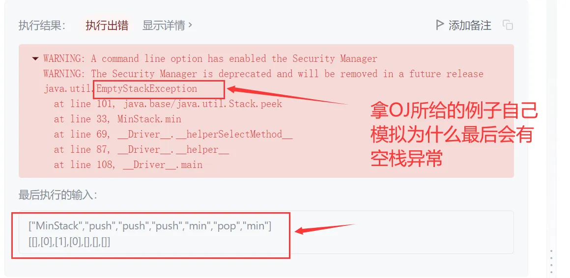 注意在push方法中我们有一个if语句是用于判断当前所要插入stack中的元素跟我们用于存储最小元素的minstack的栈顶元素谁大谁小的判断的语句,意思就是说假如我们要插入的元素大于我们当前minstack的栈顶元素的时候,就不插入到minstack当中去了,否则当小于等于当前minstack的栈顶元素的时候,就选择插入进去.我这里就没有考虑到等于的情况,光考虑到小于的情况了,所以就出现了错误:报了以下警告…