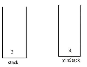 首先将我们的3进行入栈操作,因为stack中此时为空,那么3在stack这个栈中算是最小的元素了,所以当3入到stack这个栈中后,minStack这个栈也要将3这个元素入进去,如下所示: