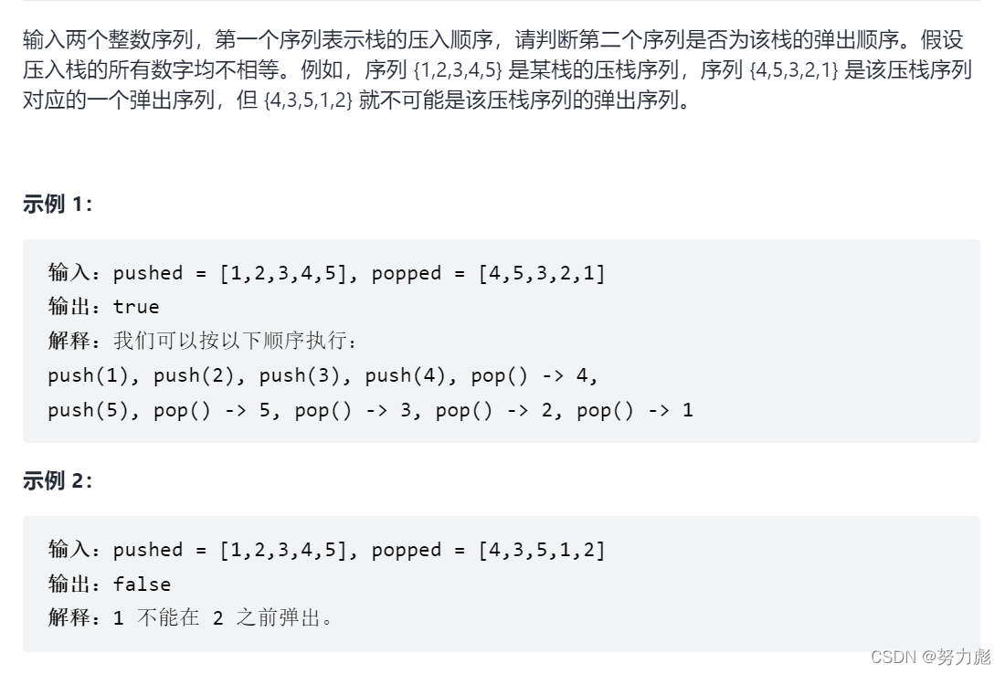 class Solution { public boolean validateStackSequences(int[] pushed, int[] popped) { //定义一个辅助栈 Stack<Integer> stack = new Stack<>(); int i = 0; int j = 0; while(j < pushed.length) { stack.push(pushed[j]); while(!stack.isEmpty()&&stack.peek() == popped[i]) { stack.pop(); i++; } j++; } return stack.isEmpty(); } }