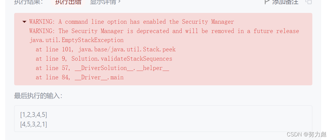 为什么这个isEmpty方法要在peek方法的前面,原因是当我们stack中的元素删除完毕后,此时如果先拿stack栈顶元素的话,可能会报空栈异常:如下所示: