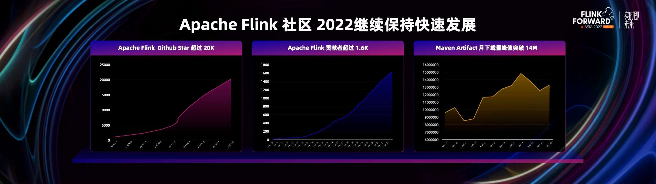 在开发者生态方面,我们也已经积累了超过 1600 名的开发者,为 Flink 社区做贡献,2022 年又新增加了 200 多名开发者。从下载量上也可以看到,Flink 在 2022 年再创新高,月度峰值的下载量最高已经突破 1400 万次。