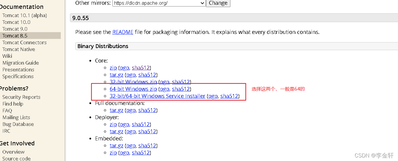 点击左侧的导航栏Download下方选择最新的Tomcat 9,出现以下页面,点击页面下方的“64-bit Windows zip (pgp, sha1,sha512)“进行下载。