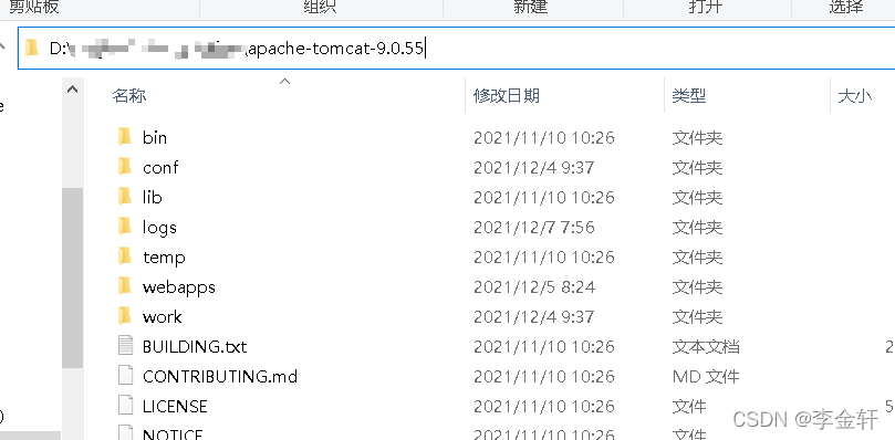 建议把解压后里面的"apache-tomcat-9.0.55"文件夹直接拉出来到解压路径(即现在路径为D:\Java\apache-tomcat-9.0.55),方便后续步骤。如下: