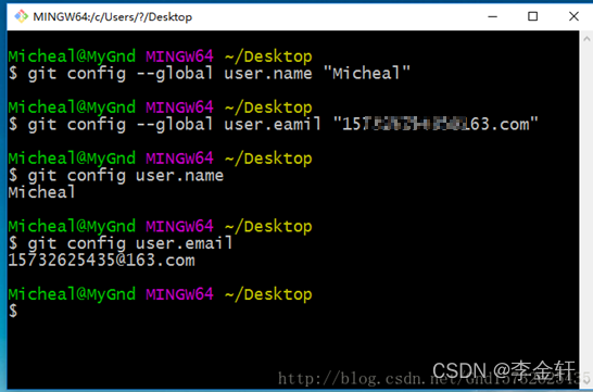 安装完成后,我们需要进行两项配置,一项是配置自己的名字,一项配置自己的邮箱地址,配置的目的是为了可以方便查看是谁修改的代码,以做确定身份之用。在桌面任意处右击—选Git Bash Here,在弹出的Git Bash命令框中输入下面的命令: