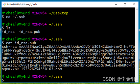 我们从服务器克隆代码的时候,需要一个身份验证。如果将你的公钥放入到服务器,你就而已从上面克隆和推送代码了。 如何生成公钥?在Git Bash中输入命令ssh-keygen -t rsa -C "your email address",一路回车即可。如下图所示就算成功。公钥放在什么地方?它放用户主目录下的.ssh文件中(备注:路径默认唯一,用户可以自己设置密码,设置密码之后使用自己的私钥对应服务器上的公钥,也可以下载代码。),里面有id_rsa和id_rsa.pub两个文件,这两个就是SSH Key的秘钥对,id_rsa是私钥,id_rsa.pub是公钥。你需要注册然后添加到服务上,你才可以克隆代码。