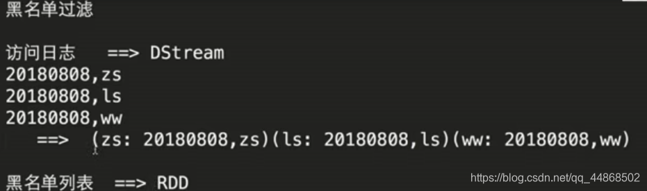 object Black extends App { import org.apache.spark.SparkConf import org.apache.spark.streaming.{Seconds, StreamingContext} val sparkConf = new SparkConf().setMaster("local[2]").setAppName("WordCount") val ssc = new StreamingContext(sparkConf,Seconds(5)) /** * 构建黑名单 */ val blacks = List("zs","ls") val blacksRDD = ssc.sparkContext.parallelize(blacks).map(x=>(x,true)) //for(x<-blacksRDD){ // println(x) //} val lines = ssc.socketTextStream("hadoop2", 9999) val clicklog = lines.map(x=>(x.split(",")(1),x)).transform(rdd=>{ rdd.leftOuterJoin(blacksRDD) .filter(x=>x._2._2.getOrElse(false)!=true) .map(x=>x._2._1) }) clicklog.print() ssc.start() ssc.awaitTermination() }