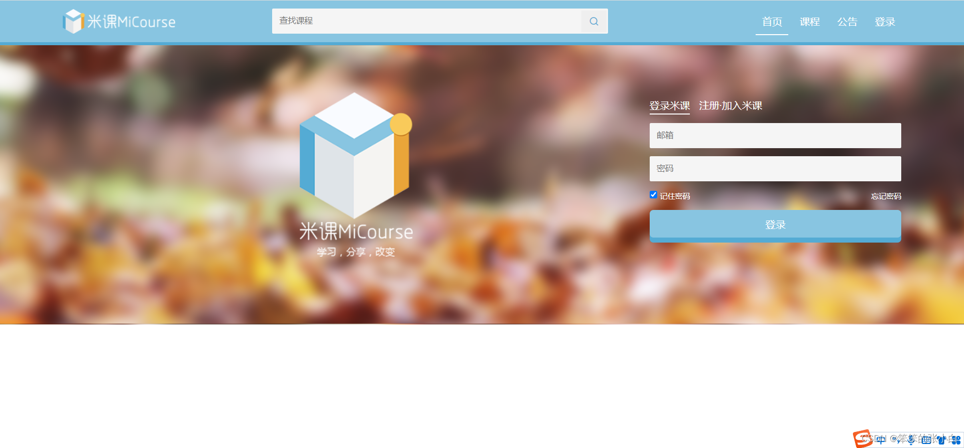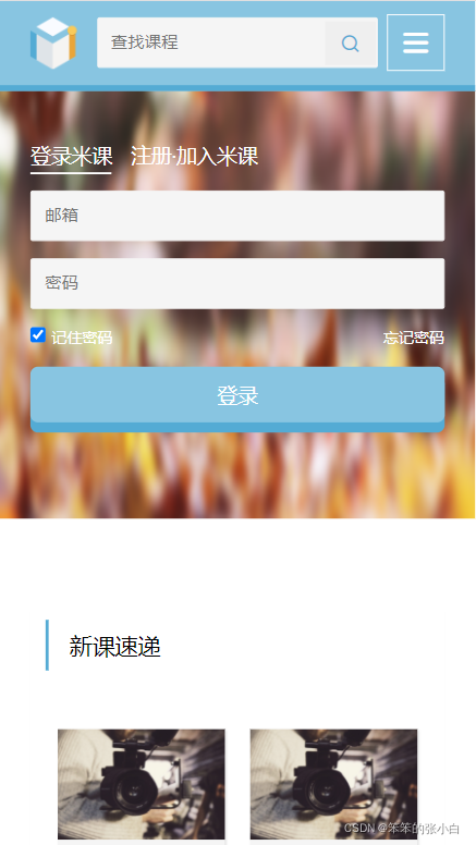 <!-- 登录开始 --> <div class="login"> <div class="wrap"> <div class="login-logo"> <img src="../media/MiLogo.png" alt=""> <br> <img src="../media/miTitle.png" alt=""> </div> <div class="form"> <form> <ul> <li><a href="#" class="nav-bar-active">登录米课</a></li> <li><a href="#">注册·加入米课</a></li> </ul> <input type="text" class="text-input" placeholder="邮箱"> <input type="text" class="text-input" placeholder="密码"> <div class="rem"> <input type="checkbox" checked> <span>记住密码</span> <a href="#">忘记密码</a> </div> <button>登录</button> </form> </div> </div> </div> <!-- 登录结束 -->