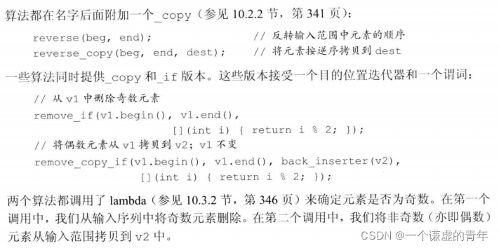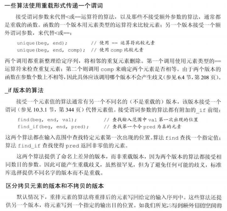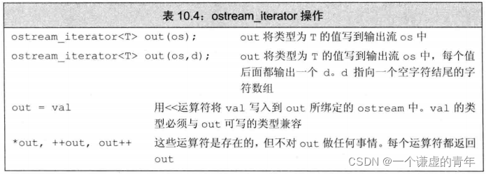//使用ostream_iterator来输出值的序列 std::ostream_iterator<int> out_iter(std::cout," "); std::vector<int> vec; for (auto e : vec){ *out_iter++= e; //赋值语句实际上将元素写到cout //运算符++和*对ostream_iterator不做任何事 } std::cout << std::endl; //用out_iter时,可忽略解引用和递增 for (auto e : vec){ out_iter = e; //赋值语句实际上将元素写到cout } std::cout << std::endl; std::copy(vec.begin(), vec.end(), out_iter); std::cout << std::endl;
