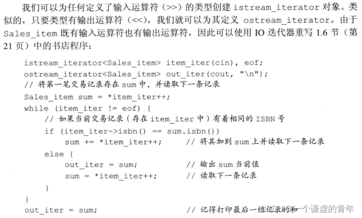 std::istream_iterator<int> int_iter(std::cin); //绑定一个流,从cin读取int std::istream_iterator<int> eof; //默认初始化迭代器,尾后迭代器 std::vector<int> vec; while (int_iter != eof){ //后置递增运算读取流,返回迭代器的旧值 //解引用迭代器,获得从流读取的前一个值 vec.push_back(*int_iter++); } } //元素范围是通过关联的流中读取数据获得的,这个构造函数从cin中读取数据, //直至遇到文件尾或者遇到一个不是int的数据为止 std::istream_iterator<int> int_iter(std::cin),eof; std::vector<int> vec(int_iter, eof); //#include <fstream>std::ifstream in("file"); std::istream_iterator<std::string> str_it(in); //从in读取字符串