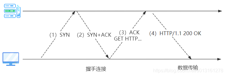 - (3)ACK Client向Server发送一条确认信息,这个TCP分组中ACK标记被置位,表示已经建立了连接,且允许携带HTTP数据,这样可以减少一次请求