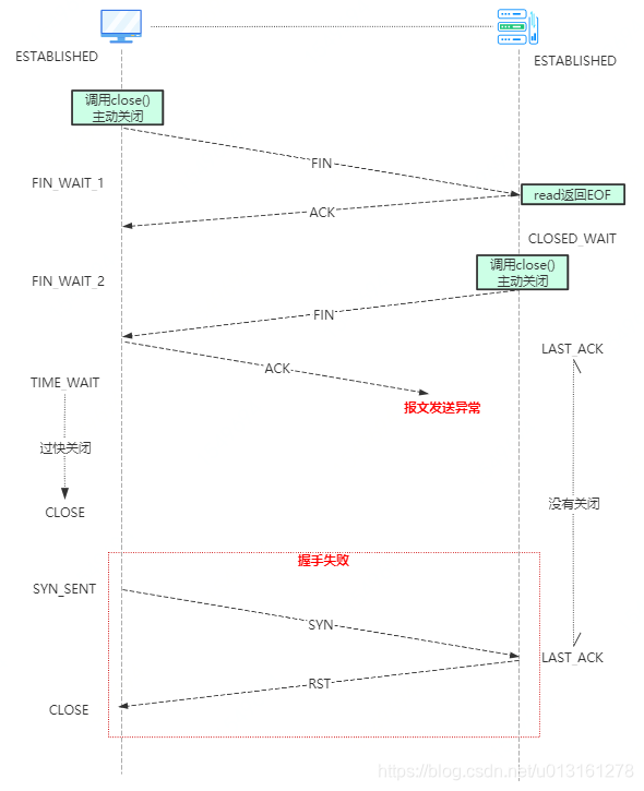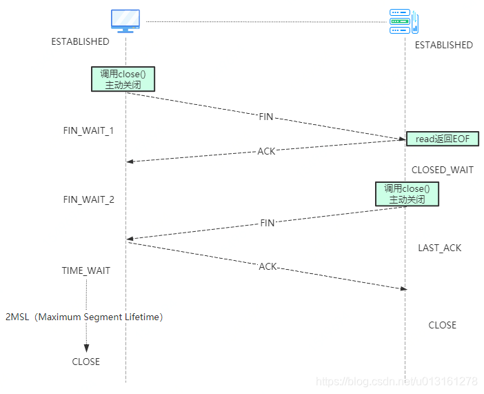 如果TIME-WAIT时间设置过短,发起关闭的一端会立刻进入CLOSE状态,而发送给另一端的ACK报文可能丢失没有让被动关闭的一端收到,也就是说被动关闭的一端没有得到关闭连接的报文,一直处于LAST_ACK状态,迟迟无法进入CLOSE状态,当下一次新的TCP连接建立的时候,新连接建立请求会发送SYN报文,而未成功关闭的一方还停留在上一个工作未关闭状态直接返回RST报文,因此新的连接过程就被关闭了,受到影响了。 - 为什么是2MSL的时长?