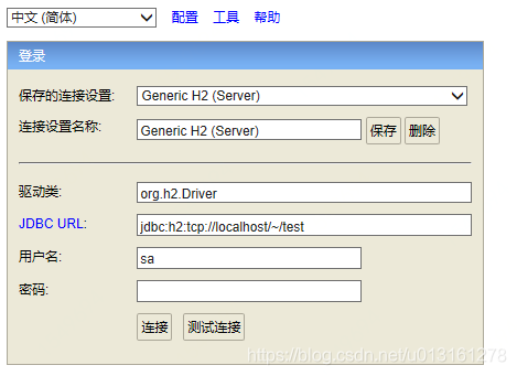 jdbc:h2:~/test //连接位于用户目录下的test数据库