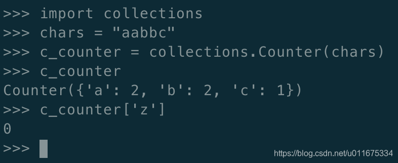 本题中主要用到了 collections.Counter() 用法,其比较巧妙的一点是:如果没有某个 key,则会默认这个 key 出现的个数为 0。示例如下: