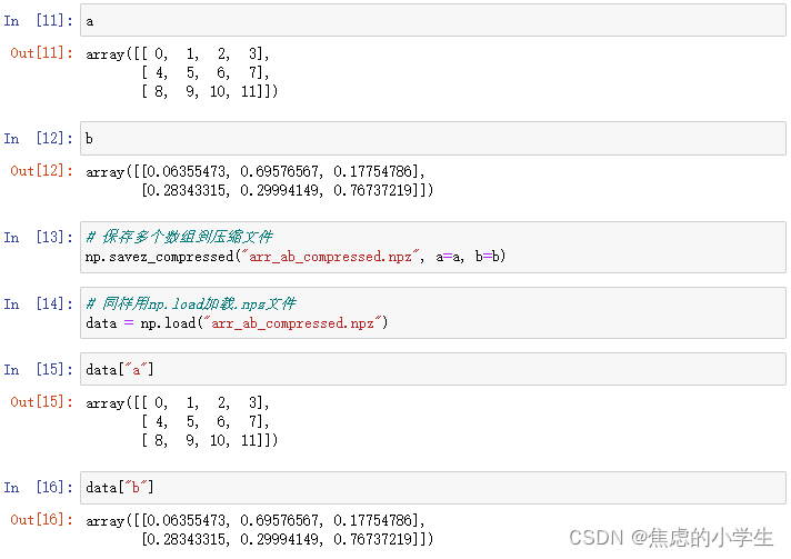 4. np.savez_compressed(filename, arra=arra, arrb=arrb):将多个numpy数组保存到.npz压缩的文件格式中
