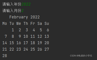 import calendar year =int(input("请输入年份:")) month = int(input("请输入月份:")) print(calendar.month(year,month))