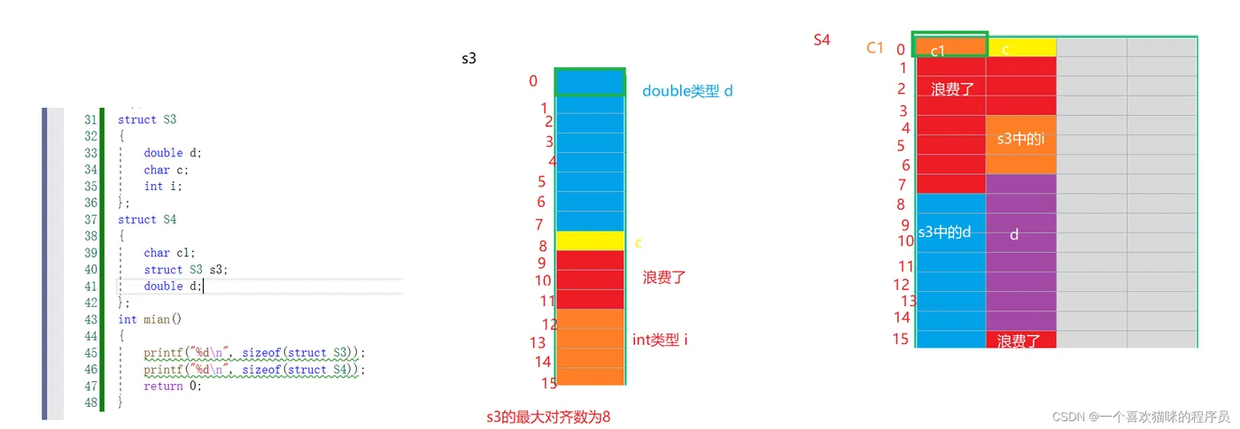 而我们将嵌套的结构体(s3)的内存空间找到了,我们我偏移量来到了23,下一个偏移量空间的编号为24,而s4的下一个变量刚好是对齐数为8的double型,刚好可以放进去(如果嵌套的结构体的下一个编号不是8的整数倍,我们也得找到下一个8的整数倍放进去,浪费空间没有办法避免)