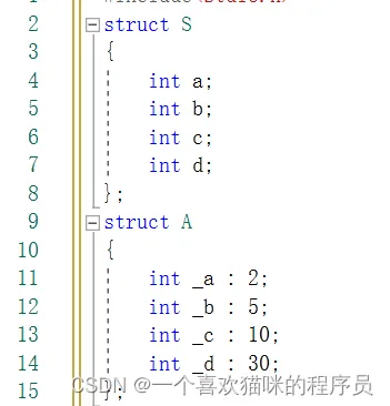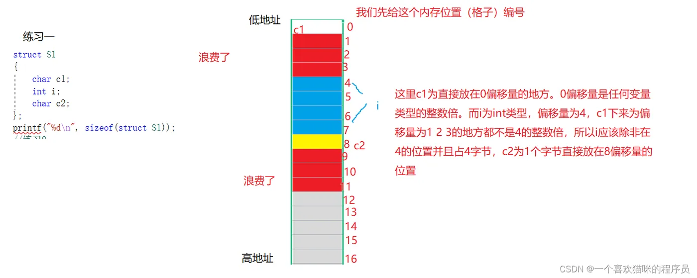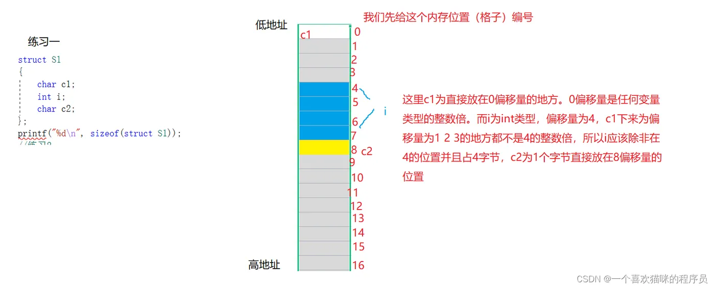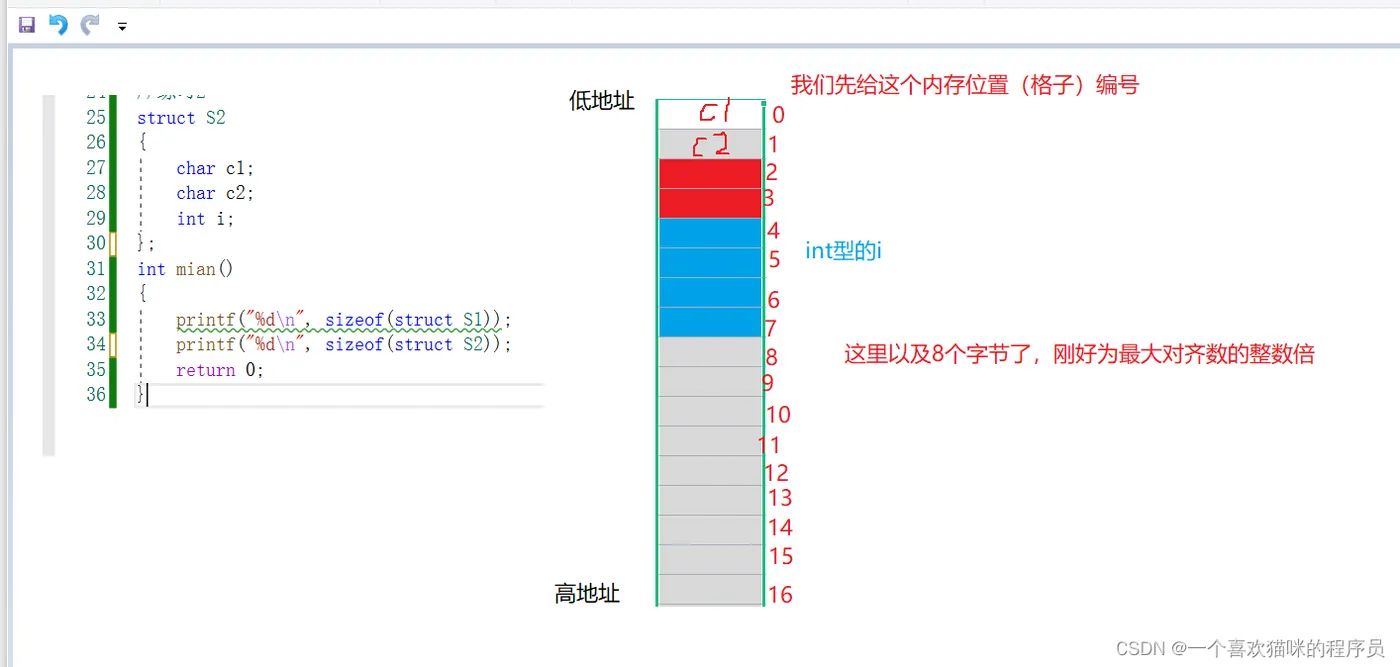 struct S1//代码1 { char c1; int i; char c2; }; //printf("%d\n", sizeof(struct S1)); //练习2 struct S2 { char c1; char c2; int i; }; //printf("%d\n", sizeof(struct S2)); int mian() { printf("%d\n", sizeof(struct S1)); printf("%d\n", sizeof(struct S2)); return 0; }