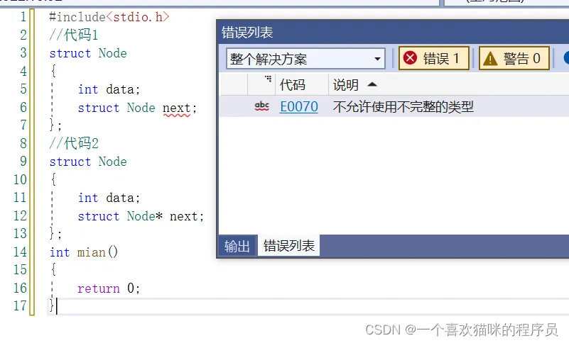 //代码1 struct Node { int data; struct Node next; }; //代码2 struct Node { int data; struct Node* next; };