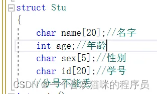 struct Point { int x; int y; }p1; //声明类型的同时定义变量p1 struct Point p2; //定义结构体变量p2 //初始化:定义变量的同时赋初值。 struct Point p3 = {x, y}; struct Stu //类型声明 { char name[15];//名字 int age; //年龄 }; struct Stu s = {"zhangsan", 20};//初始化 struct Node { int data; struct Point p; struct Node* next; }n1 = {10, {4,5}, NULL}; //结构体嵌套初始化 struct Node n2 = {20, {5, 6}, NULL};//结构体嵌套初始化