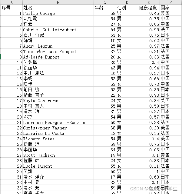import random from openpyxl import workbook from faker import Faker wb = workbook.Workbook() sheet = wb.worksheets[0] sheet.title = 'pd练习' li = ['序号', '姓名', '年龄', '性别', '健康程度', '国家'] di = {'中国': 'zh_CN', '美国': 'en_US', '法国': 'fr_FR', '日本': 'ja_JP'} with open('new_message.xlsx', mode='w', encoding='utf-8') as f: for num, item in enumerate(li, 1): sheet.cell(1, num).value = item for num, i in enumerate(range(2, 502), 1): country = random.choice(['中国', '美国', '法国', '日本']) gender = random.choice(['男', '女']) fk = Faker(locale=di[country]) sheet.cell(i, 1).value = num sheet.cell(i, 2).value = fk.name_male() if gender == '男' else fk.name_female() sheet.cell(i, 3).value = random.randint(14, 66) sheet.cell(i, 4).value = gender sheet.cell(i, 5).value = round(random.random(), 2) sheet.cell(i, 6).value = country wb.save('new_message.xlsx')