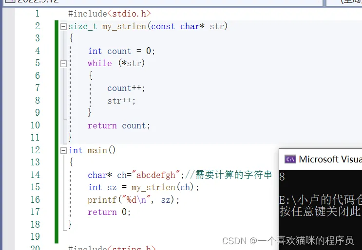 #include<stdio.h> size_t my_strlen(const char* str) { int count = 0; while (*str) { count++; str++; } return count; } int main() { char* ch="abcdefgh";//需要计算的字符串 int sz = my_strlen(ch); printf("%d\n", sz); return 0; }