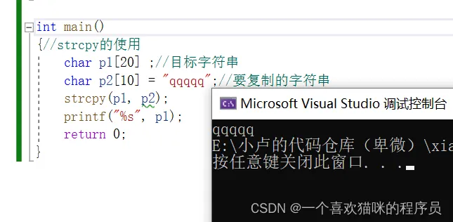 int main() {//strcpy的使用 char p1[20] ;//目标字符串 char p2[10] = "qqqqq";//要复制的字符串 strcpy(p1, p2); printf("%s", p1); return 0; }