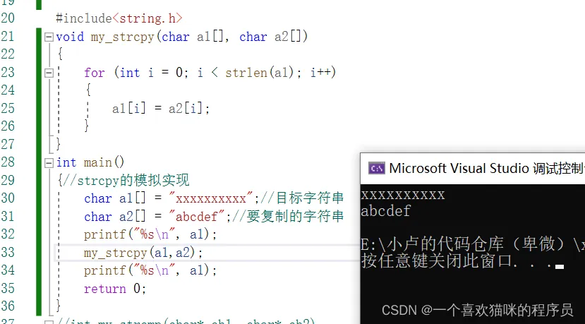 #include<string.h> void my_strcpy(char a1[], char a2[]) { for (int i = 0; i < strlen(a1); i++) { a1[i] = a2[i]; } } int main() {//strcpy的模拟实现 char a1[] = "xxxxxxxxxx";//目标字符串 char a2[] = "abcdef";//要复制的字符串 printf("%s\n", a1); my_strcpy(a1,a2); printf("%s\n", a1); return 0; }