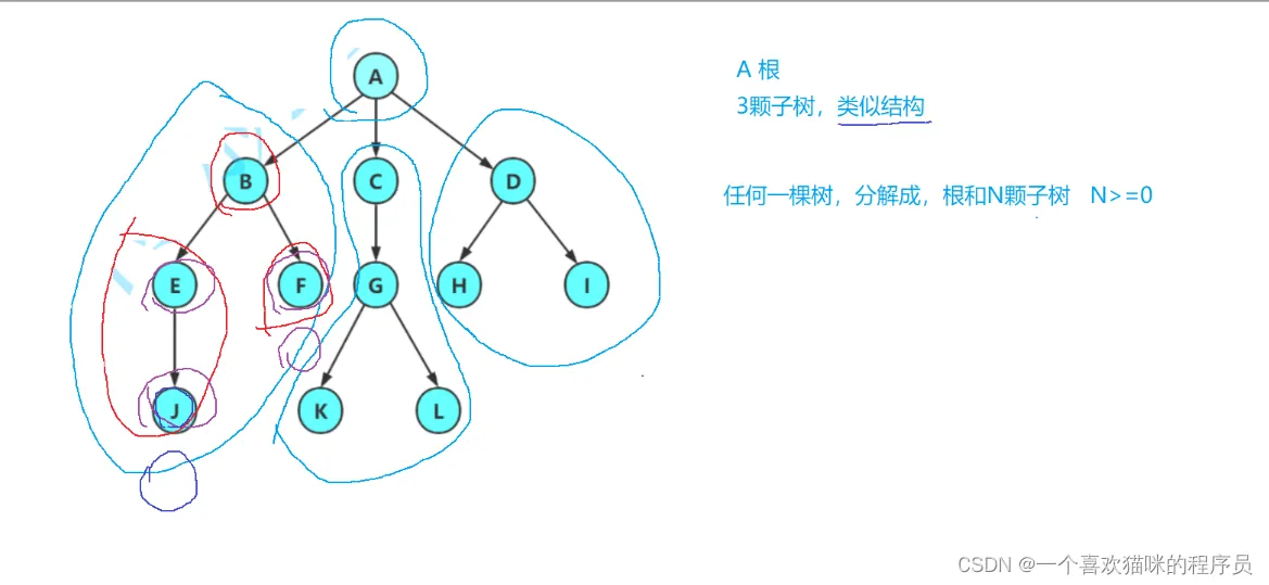 - 有一个特殊的结点,称为根结点,根节点没有前驱结点,如上图的A