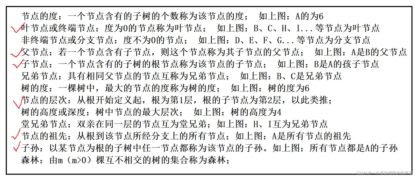 - 度就是该节点含有的子树个数,比如A的子树有6个,F的子树有3个。