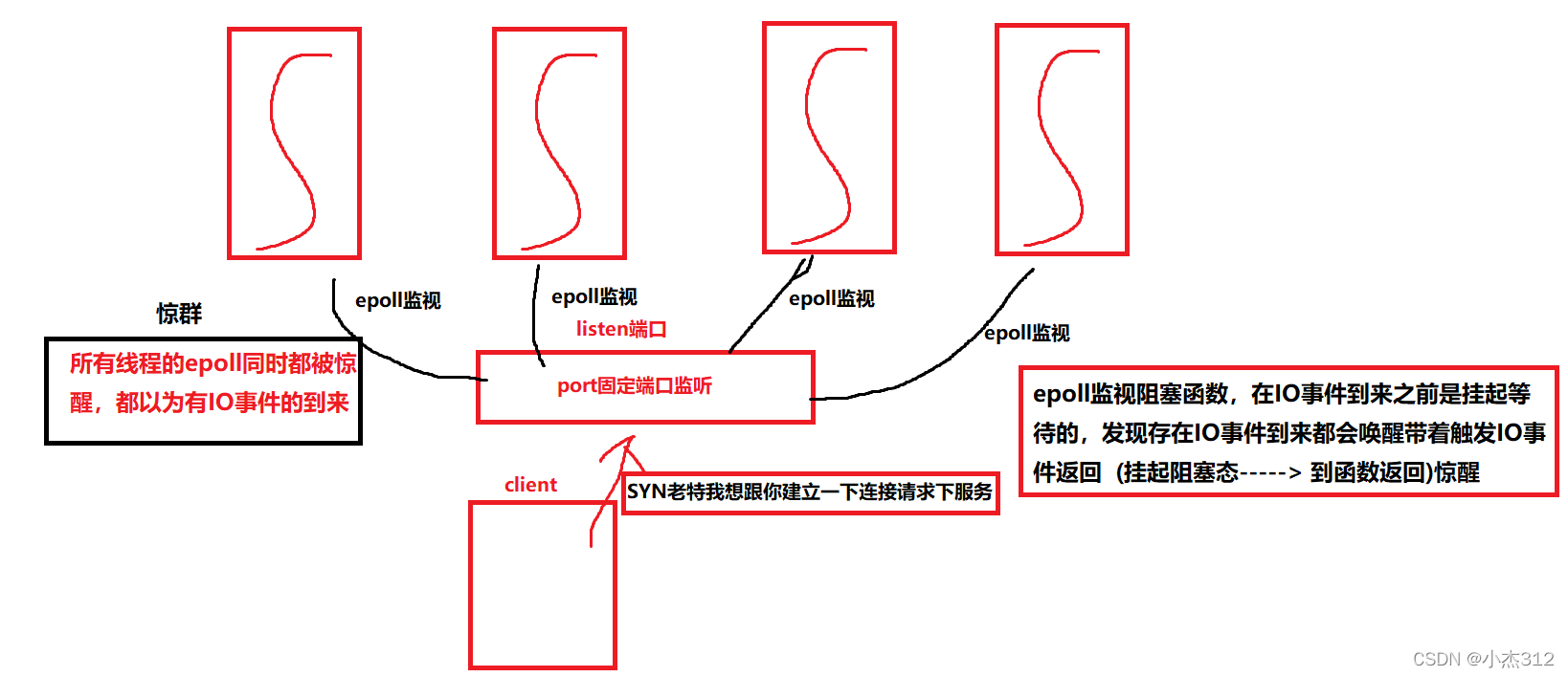 同样如果将上述的多个线程换成多个进程共享监视 同一个 listenfd 就是(多进程的epoll惊群现象) 咱再画一个草图再来理解一下这个惊群: