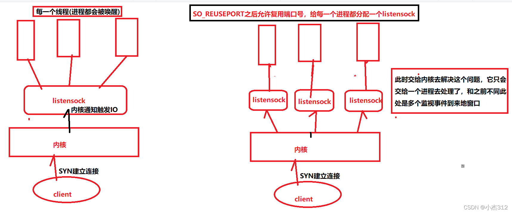- 方式2: 是小杰可以理解地方式方法: 使用 设置SO_REUSEPORT:使得端口号可以复用, 如此多个进程或者线程便可以绑定同一个端口号了 这样相当于是每一个进程或线程都监视一个listensock