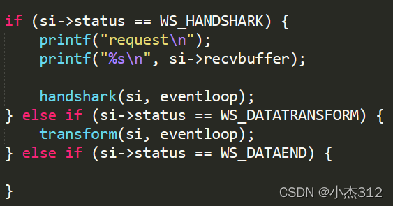 enum WEBSOCKET_STATUS { WS_HANDSHARK,//握手状态 WS_DATATRANSFORM,//数据交互状态 WS_DATAEND,//断开状态 };
